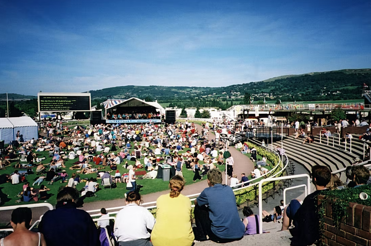 I arrived at Cheltenham Racecourse on Friday afternoon around 4pm, just as things were starting to whirr into life. Queuing for a programme I caught a glimpse of dreadlocked protester types, skaters, families, and monks in brown robes milling about. Having got coffee and cake (for many Greenbelters, a staple diet) I sat down on the circular concrete steps of the small arena in the Grandstand to enjoy the view of tents, stalls and mounting, antlike activity under the cloudless sky. When the opening beat, scratch and riff of Run-DMC’s “Walk This Way” kicked off from the towering banks of speakers, I knew I was home.